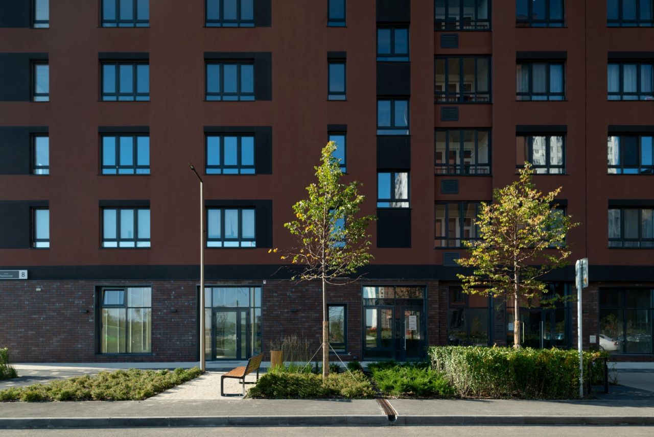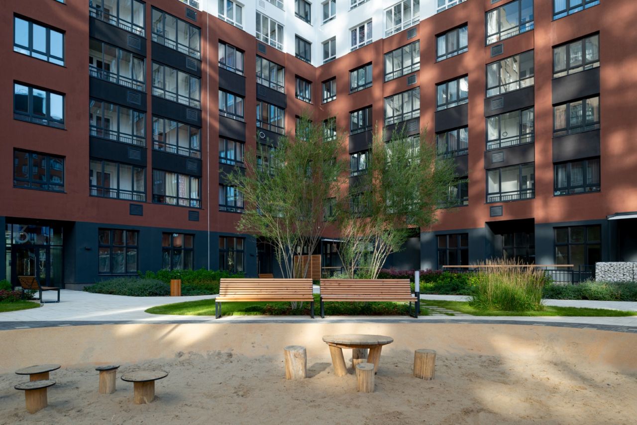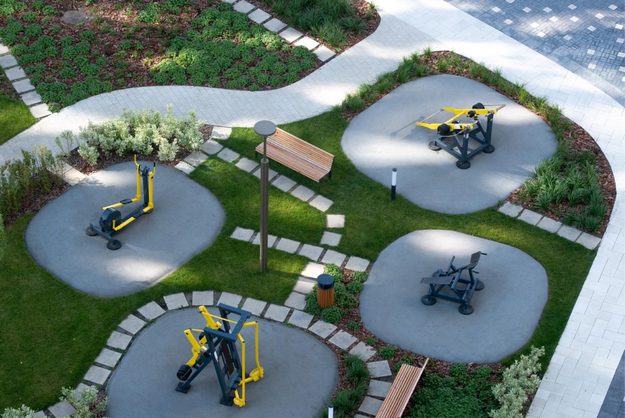 Жилой квартал состоит из п-образных корпусов с закрытыми от машин дворами, где обустроены детские площадки и места для отдыха с шезлонгами. Между домами расположены парки с игровыми комплексами для разных возрастов, воркаут-зонами с тренажёрами, брусьями и турниками и полями для футбола, волейбола и баскетбола. С внешней стороны корпусов размещены наземные парковки с электрозарядками.